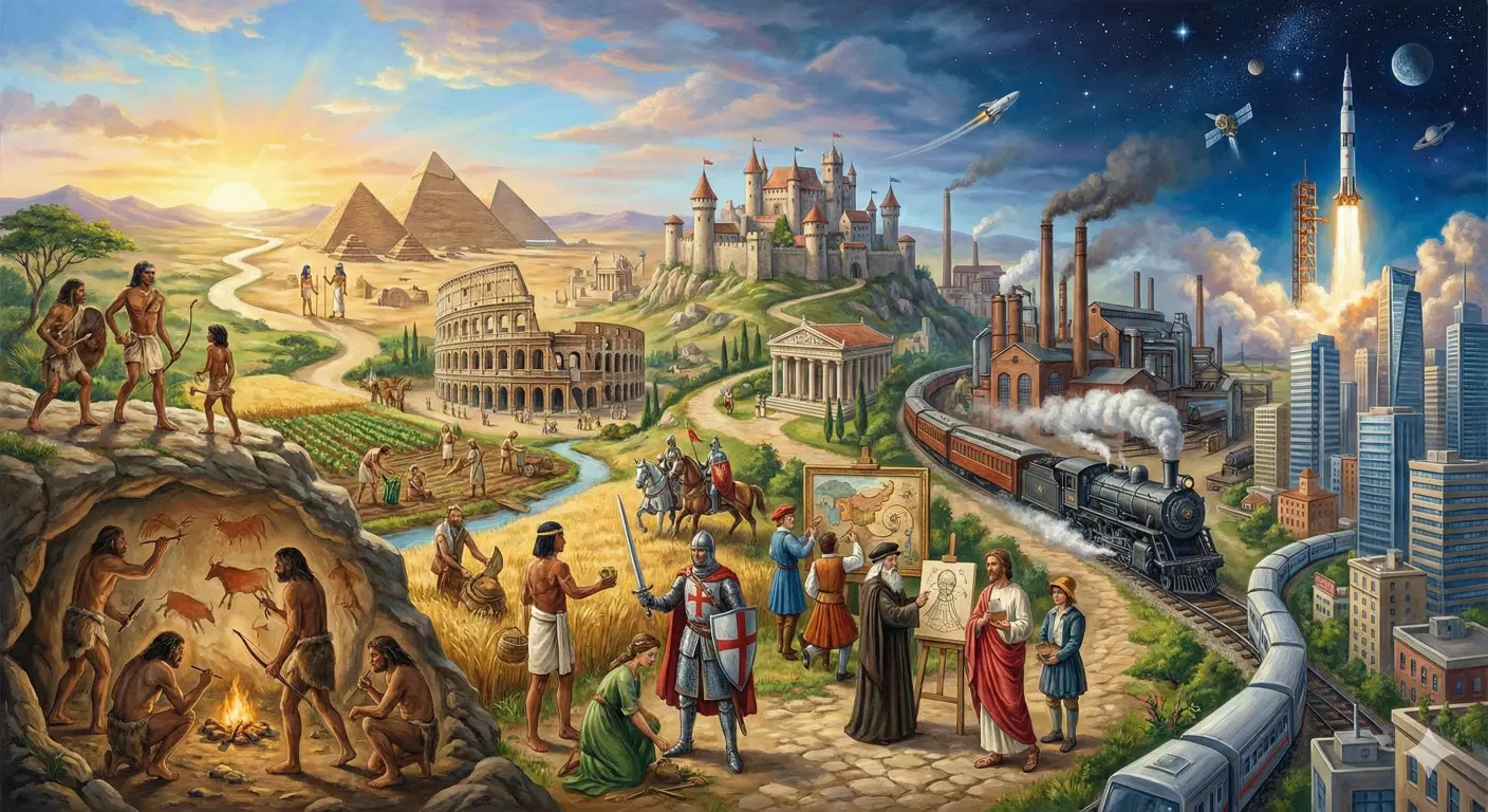 মানব জাতির ইতিহাস আসলে মানুষের ধীরে ধীরে মানুষ হয়ে ওঠার গল্প। এটি কোনো হঠাৎ ঘটে যাওয়া ঘটনা নয়, বরং অসংখ্য দিনের সংগ্রাম, ভুল, শিক্ষা আর অভিজ্ঞতার ফল। এই ইতিহাসে মানুষের দুঃখ দুর্দশার কান্না আছে, স্বপ্ন আছে, ভয় আছে, আবার সাহসও আছে। মানুষ যেমন প্রকৃতির কাছে বারবার পরাজিত হয়েছে, তেমনি নিজের বুদ্ধি ও চেষ্টায় সে প্রকৃতির অনেক রহস্য উন্মোচন করতেও সক্ষম হয়েছে। মানব ইতিহাস তাই কেবলই একটি অতীতের কাহিনি নয়; এটি মানুষের পরিবর্তনের একটি ধারাবাহিক দলিল।আদিম যুগে মানুষ ছিল প্রকৃতির এক অসহায় প্রাণী। খাদ্যের সন্ধানে তাকে ঘুরে বেড়াতে হতো, রাত কাটাতে হতো গুহায় কিংবা খোলা আকাশের নিচে। বন্য পশু, ঝড়-বৃষ্টি ও অজানা রোগ ছিল তার নিত্যসঙ্গী। জীবন তখন ছিল খুব ছোট এবং খুবই অনিশ্চিত, প্রতিদিনিই মানুষকে অন্য কোনো প্রাণী বা প্রাকৃতিক দুর্যোগের কারণে প্রান নাশের ভয়ে মানুষকে দিনরাত্রি পার করতে হতো। তবু এই কঠিন সময়েই মানুষের ভেতরে জন্ম নেয় ভাবনার বীজ। আগুনের ব্যবহার তাকে উষ্ণতা ও নিরাপত্তা দেয়, পাথরের হাতিয়ার তাকে শক্তি জোগায়, আর গুহার দেয়ালে আঁকা ছবি, তার অনুভূতি প্রকাশের প্রথম ভাষা হয়ে ওঠে। মানুষ তার কল্পনা শক্তি যেদিন থেকেই ব্যবহার করতে শুরু করে সেদিন থেকেই মানুষ আলাদা হতে শুরু করে অন্য সব প্রাণী থেকে।সময়ের সঙ্গে সঙ্গে মানুষ বুঝতে শেখে, শুধু শিকার করে বেঁচে থাকলে ভবিষ্যৎ নিরাপদ নয়, এইযে “ভবিষ্যত” এই কথাটা নিয়ে ভাবনা, এই ভাবনায় মানুষের উন্নয়নের পথ তৈরি করেছিল। আগুন, পাথরের তৈরি হাতিয়ারের ব্যাবহারের পরে কৃষির আবিষ্কার মানব জীবনে এক বড় পরিবর্তন আনে। মানুষ যখন মাটি চাষ করে ফসল ফলাতে শেখে, তখন তার জীবনে স্থায়িত্ব আসে। নদীর ধারে ধারে গড়ে ওঠে বসতি, জন্ম নেয় গ্রাম। পরিবার ও সমাজের বন্ধন শক্ত হয়। মানুষ তার পর থেকে শুধু নিজের জন্য নয়, অন্যের জন্যও ভাবতে শেখে। এই সময়েই নিয়ম, আচার এবং নৈতিকতার ধারণা গড়ে ওঠে, যা সমাজকে একসূত্রে বেঁধে রাখে।এই সামাজিক জীবনের পরিণত রূপ দেখা যায় প্রাচীন সভ্যতাগুলোতে। মেসোপটেমিয়া অঞ্চলে মানুষ প্রথম লেখার মাধ্যমে নিজের কথা ভবিষ্যতের জন্য রেখে যায়। সেখানের আইন ও শাসনব্যবস্থা সমাজকে শৃঙ্খলিত করে। প্রাচীন মিশর-এ মানুষ জীবন ও মৃত্যুকে গভীরভাবে ভাবতে শেখে, যার প্রমাণ আজও পিরামিডে দেখা যায়। আবার সিন্ধু সভ্যতা দেখিয়ে দেয় পরিকল্পনা, পরিচ্ছন্নতা আর নিয়ম মেনে চলাও সভ্যতার বড় চিহ্ন। এসব সভ্যতা মানুষকে শিখিয়েছে একসঙ্গে থাকাই টিকে থাকার সেরা উপায়।কালের নিয়মে সভ্যতাগুলো ভেঙেছে, নতুন সভ্যতা গড়ে উঠেছে। মধ্যযুগে মানুষের জীবনে ক্ষমতা ও কর্তৃত্বের প্রভাব বেড়ে যায়। রাজা ও শাসকের সিদ্ধান্তই হয়ে ওঠে সাধারণ মানুষ